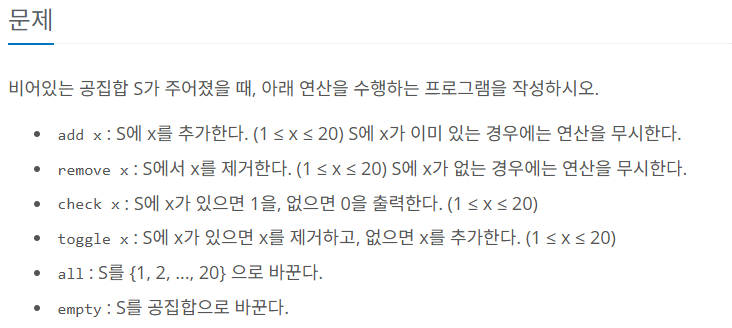 이 문제는 1부터 20까지의 숫자로 이루어진 집합 S에 대해 여러 가지 연산을 수행하는 문제이다.