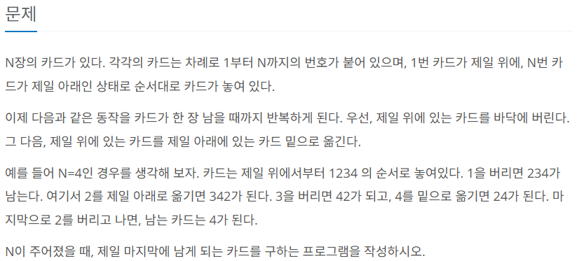 이 문제는 카드가 놓인 상태에서 맨 위 카드를 버리고, 그 다음 카드를 맨 아래로 옮기는 과정을 반복하여