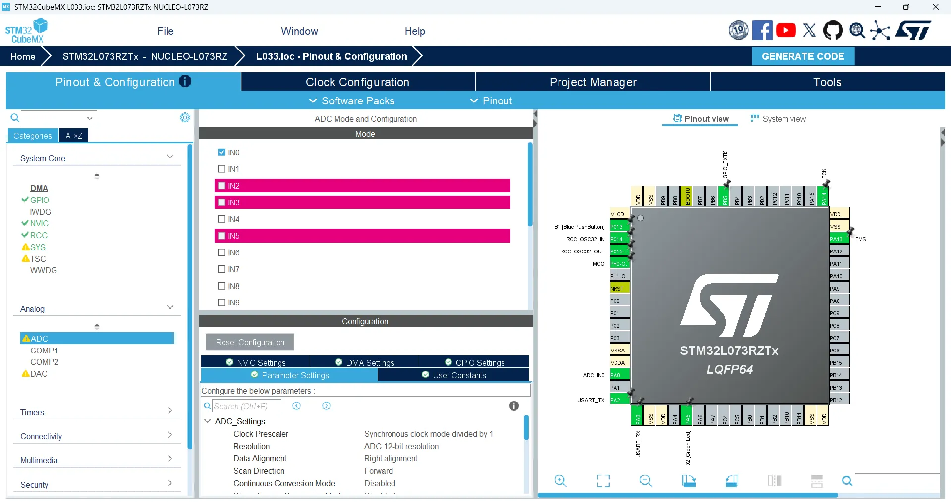 MXCube에서는 ADC를 선택한 후 IN0에 체크해준다.