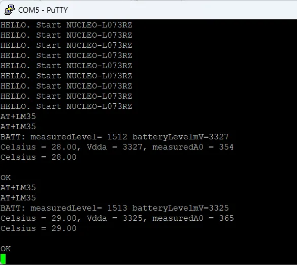 아래와 같이 PuTTY에서 AT+LM35를 입력해주면, 온도 값이 출력되는 것을 확인할 수 있다.