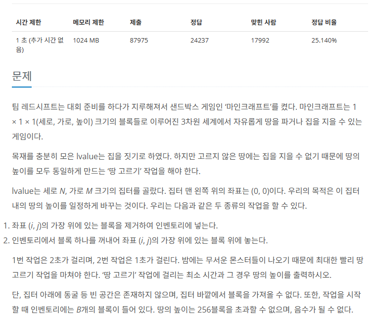 (인벤토리 블록이 음수라는 것은, 갖고 있는 블록보다 오바해서 사용한 것이다.) - 가능한 높이들 중에서 시간이 최소인 것을 고르고, 시간이 같다면 문제 조건대로 높이가 더 높은 것을 선택한다.